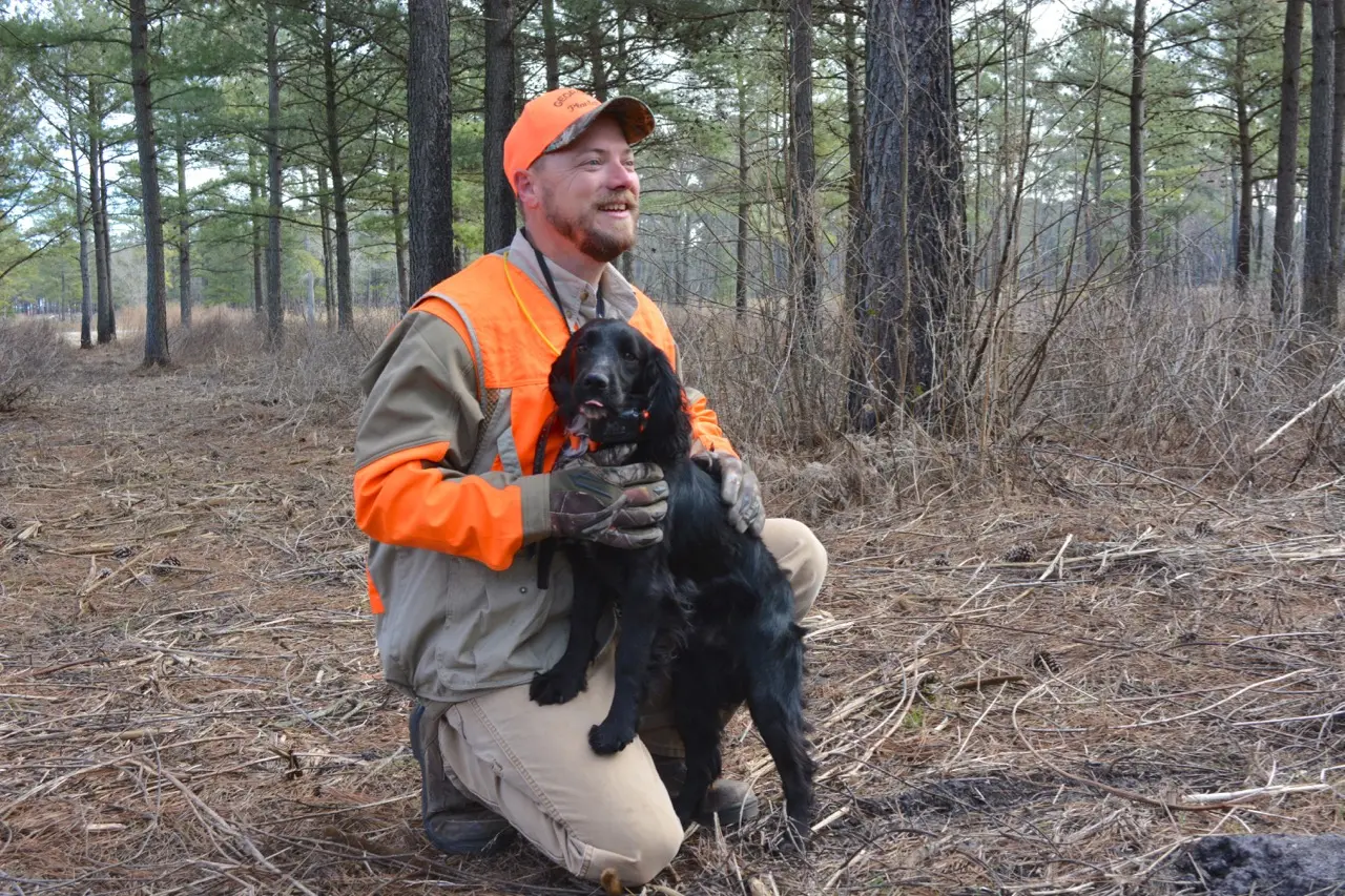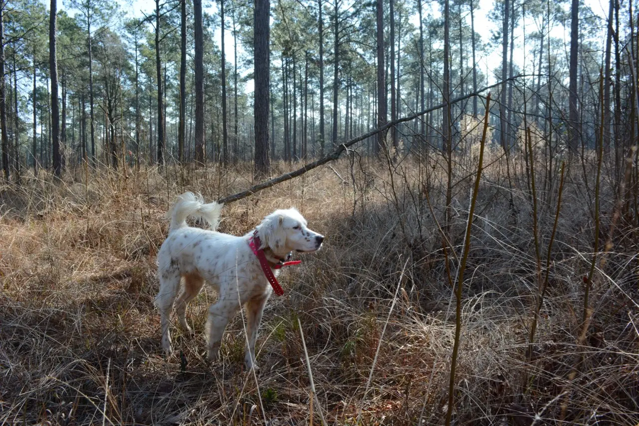They would have recognized the landscape reemerging at George Hi—and the feeling I’m getting as we move deeper into a tract of timber, trunks blackened with a recent controlled burn and underlain with newly restored grasses. My breath drifts from left to right, signaling a crossing wind, and George Hi guide Bryan Hargrove lets Jake range a bit farther, giving him room to loop and swing and work the wind without being underfoot.