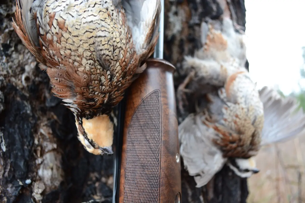 It’s as if Mae senses that she’s pushing her limits and better bring an offer to the table fast, for right then she freezes, four paws on the ground, muzzle canted a quarter-turn to starboard. “These dogs are making us look better than we are,” George grins, as we move upslope to Mae. But he speaks too soon. This bird knows how to negotiate. It bursts from the base of a fire-blackened trunk, straight up. It’s perfectly positioned to force my gun up and overhead as I twist to the left, weight on my heels, and just as the bead catches up with the bird, I’ve over-rotated and feel it all come apart. The shotgun butt loses touch with my shoulder, my cheek cheats over the comb, the gun goes off and the bird knows and I know and the dogs know that I’ve been beat.
