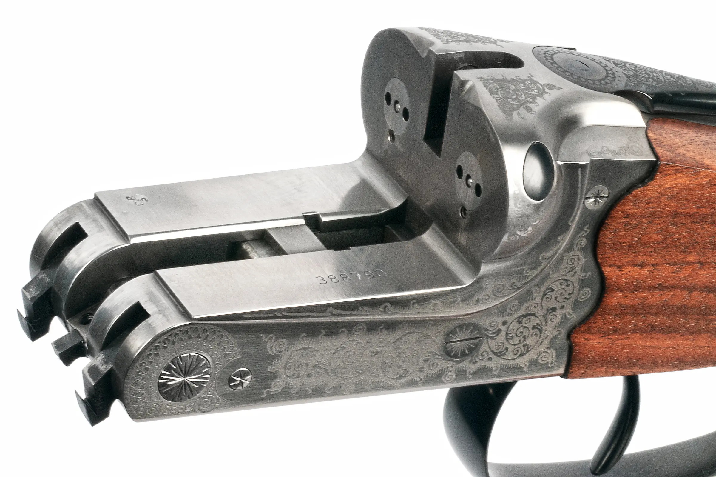 The 40E is a clone—in its barrels and action—of other Merkel boxlocks that can cost nearly twice as much. It is every bit the gun but in plainer dress. Merkel ranks the 40E’s straight-grained wood a Class 2 on a scale that goes to 5; it has a utilitarian flat-oil finish and is capped with a plastic buttplate. The receiver has the same mustachioed profile of Germanic side bolsters flaring beneath the water table and behind the breech, but it is finished in a flat silver-nitrate gray. Partial coverage of the receiver in an unobtrusive Arabesque scroll is engraved by programmed lasers, whereas all of Merkel’s other models are at least partially carved by graver and by hand all the way up to the gorgeous, deeply carved game scenes that are archetypes of German shotgun aesthetics.