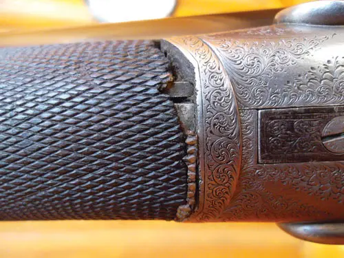 When the gun arrived, I took it to my local gunsmith, reasoning that a hundred-year-old gun deserves a thorough once-over. Though the gun had been shot by Joseph, it underwent the standard checks due an old gun, all of which revealed a sound-if-brush-worn piece. Barrel walls retained sufficient thickness, bores were un-pitted, original 2½" chambers were unaltered, and the 118-oz Nitro London proof was intact. A century of use had left the gun patinaed, however, and my gunsmith pal was somewhat cynical about what might be hiding out of sight. “Look at this,” he said, turning the gun muzzles-up and removing the forend. Probing gently with a sharpened pencil, he outlined the exposed surface of the forend wood where it met the metal knuckle of the iron. As Joseph had indicated when he’d introduced me to the gun, the forend wood had retracted from the knuckle and decomposed a bit, leaving a small gap. The depth of the issue, though not an immediate impediment to function, was anyone’s guess. “We’ll want to see what’s under there,” my gunsmith pal said, replacing the forend and returning the gun to me. “You might very well have some metal problems to deal with. There’s some rust and light pitting on the outside of the barrels, all of which indicate exposure to a bit of moisture and neglect at some point; and wood can hide a lot. That said, it is tight on face. I’ll dig a little deeper when I get the time . . . .”