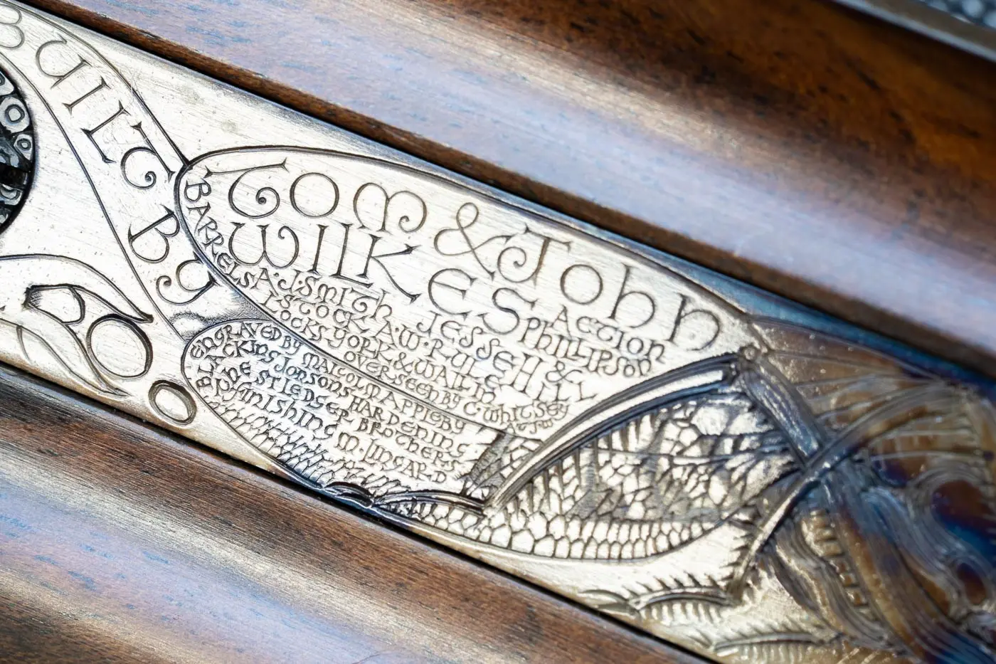 “Many skilled craftsmen and women work on a complete gun. I have tried to honour them by engraving their names on the forend iron within a dragonfly. There are no visible names amongst the engraving, which gives the design more scope to complement the form of the gun. I engraved the names of Tom and John Wilkes on the flat of the action. Tom never had his name on a gun; now he has. My name is on the flats as well.