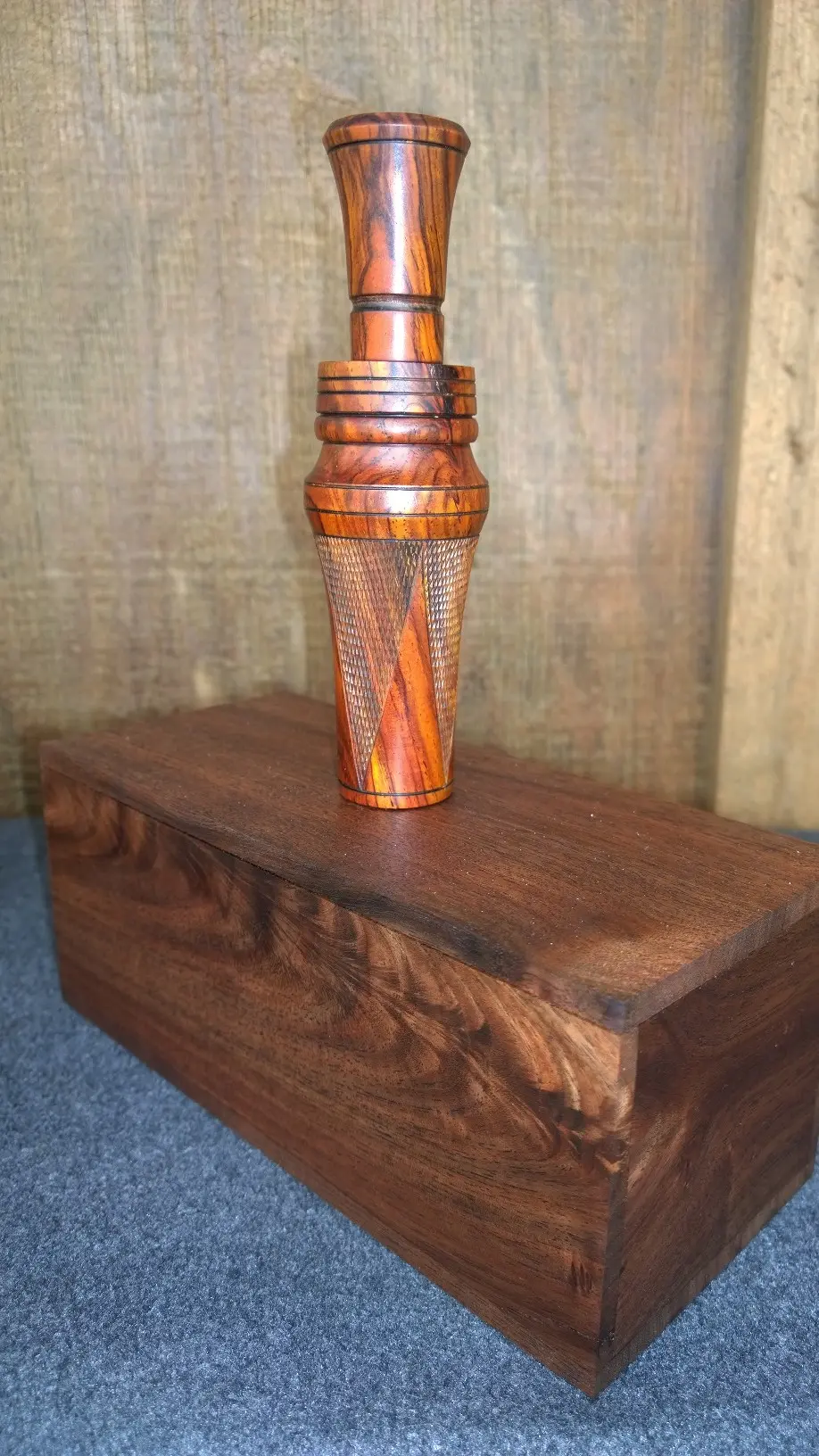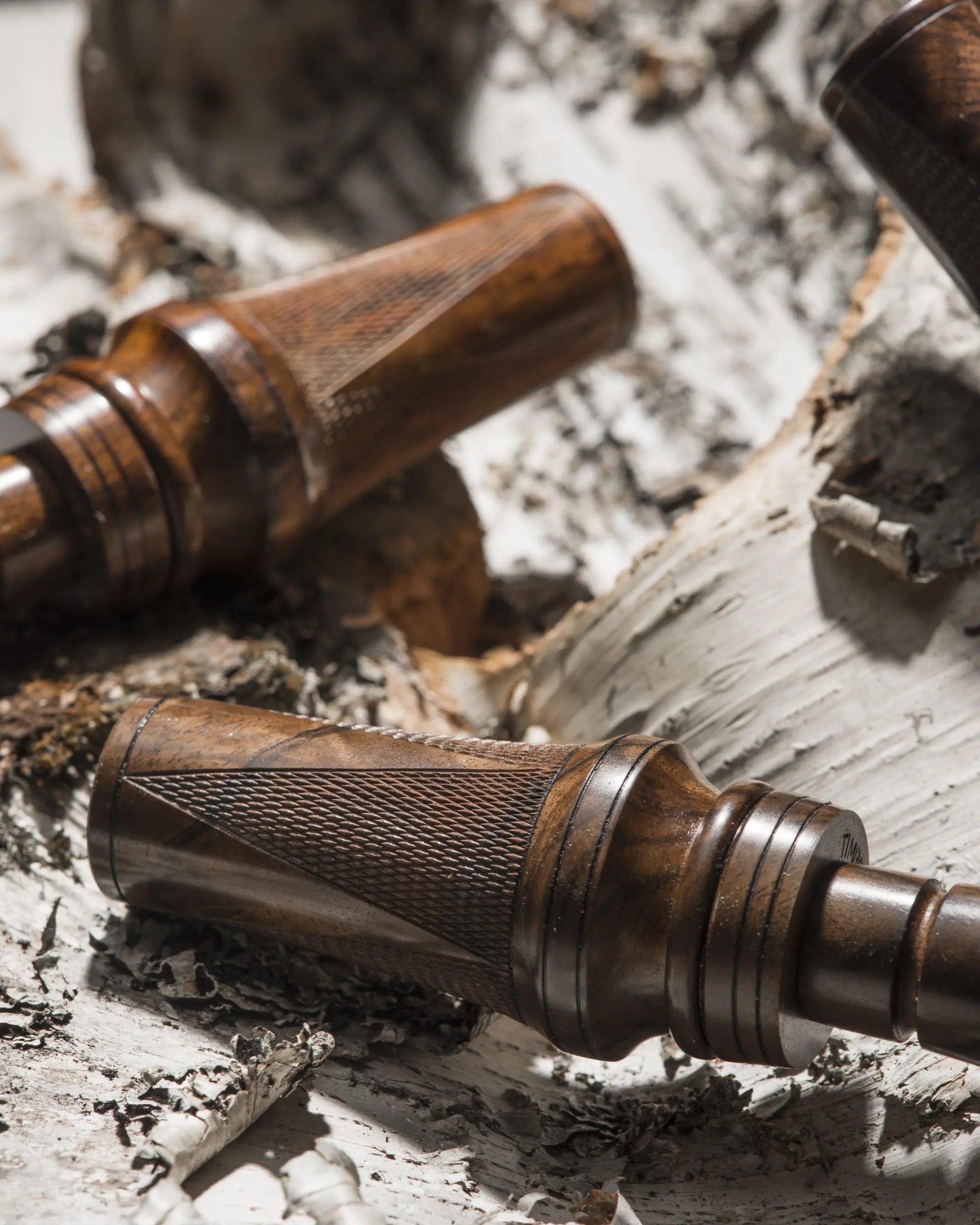 Fast-forward to now: Brian and Parker have begun producing the TimberLuxe Heirloom Duck Call. Made entirely in their shop, the calls start as figured walnut or dense, exotic hardwoods like cocobolo and African blackwood. The calls are turned, checkered, finished and tuned in-house, and they are available as single- or double-reed with inserts that can be one piece or sleeved with cocobolo, African blackwood or acrylic.