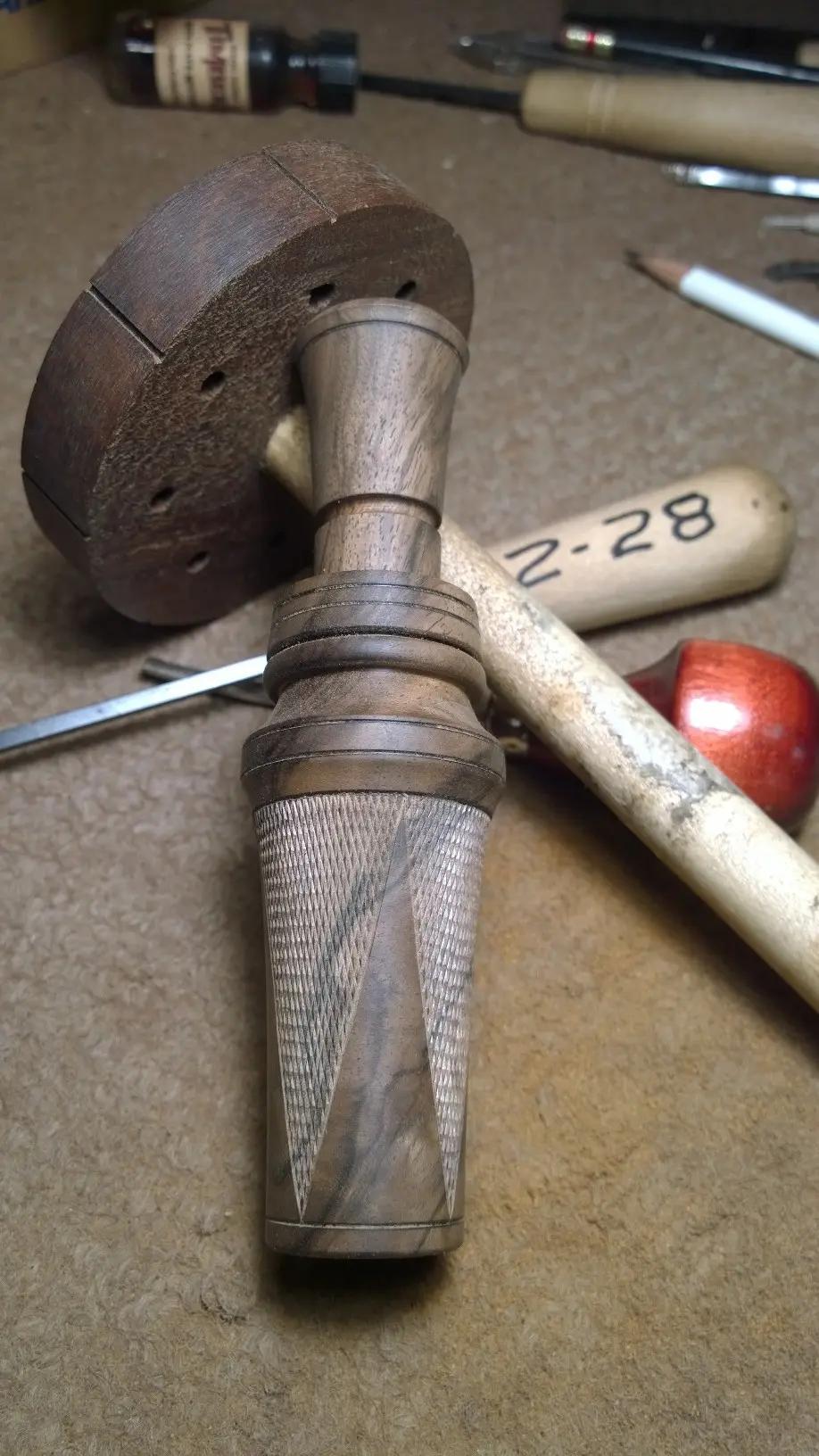So what’s this about calling ducks? That, too, comes from the woodworking. The evolution, in short: Starting in about 2000, a friend was building calls and Board began checkering them. His oldest son, Parker, took up duck hunting and learned to call from a mentor. About 2006 Brian drew up a call and, with plenty of walnut in his shop, plans took shape. In 2013, the former call developer for Lohman Game Calls, Brad Harris, taught Parker the subtleties of tuning a call.