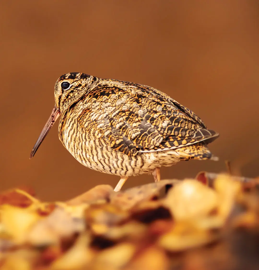American woodcock are small, plump birds typically weighing five to eight ounces, with the females being generally larger than the males. Because of the woodcock’s unusual features, the Seneca Indians believed that the Creator assembled the bird from the leftover parts of other birds. Woodcock have round bodies, short legs and long beaks, with large eyes set high on their heads so that they can see 360° around. Their ears are located between their eye sockets and bill, and their nostrils are set at the top of their bill. Most interesting is that their cerebellum is below the rest of the brain and above the spinal column—whereas in other birds it is in the rear of the skull—so in essence they have upside-down brains. They also are excellently camouflaged for their wooded habitat, their plumage being a mottled mix of russet, brown, gray and black, with lighter buff colors on the chest.