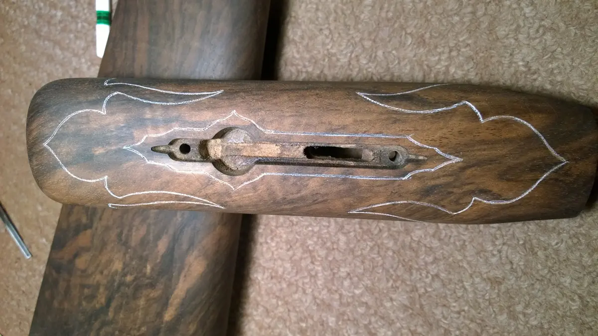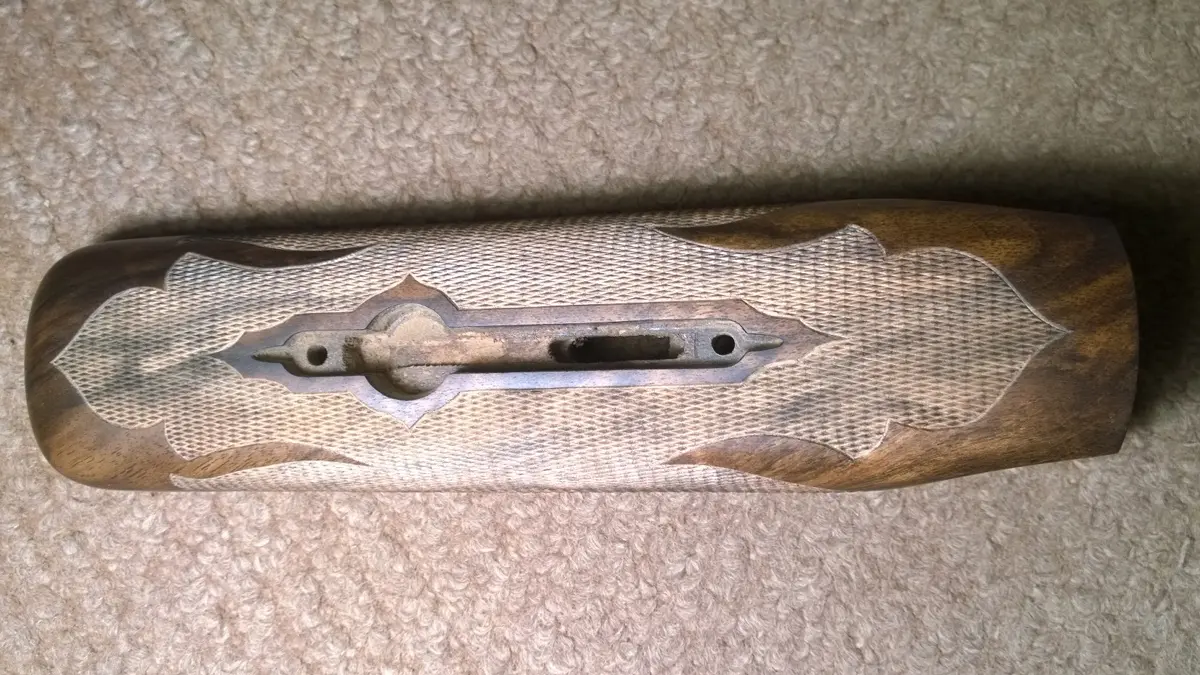 “The rest of the blank I shaped from a solid block by hand, leaving the length of pull at 15", so the future owner could choose what he or she wished for a termination treatment—a wooden butt, recoil pad or leather-covered pad. The pitch could also be adjusted to his or her needs. The forend was changed to a beavertail shape, to meet the desired usage of a target gun. However, the original splinter forearm’s two latch screws would not provide enough recoil support, so I soldered a recoil lug under the forend iron, to give the wood more rigidity.”