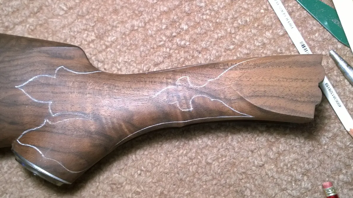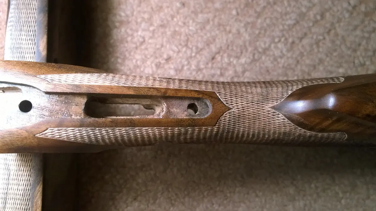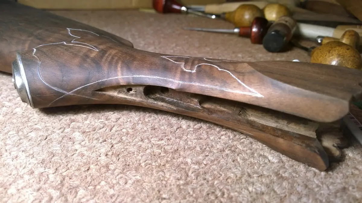 Stockmaker Craig Libhart was asked to build a stock that could be easily altered to fit the new owner. According to Craig: “The dimensions of the buttstock were going to be drastically different than the factory stock, so rather than take time to build a pattern from the original pieces, I decided to have the inletting and stock head duplicated by Gene Simillion.”