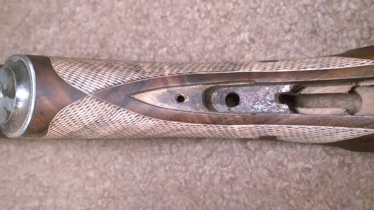 Bruce Farman removed all of the original engraving. He either filed it off or laser welded up the lines so as to not weaken the metal by over-filing. This process was done to the forend metal also. The “truing up” of an action involves making sure the outside of the metal is straight, level on both sides to the centerline of the action, fitted tight at the knuckle and hinge pin, and above all symmetrical in every way. Bruce cross-polished the metal to remove all file and grit marks, taking the finish down to 600 grit. He also draw-filed the barrels to remove any waves and minor imperfections. The barrels were cross-polished to a 600-grit finish as well.