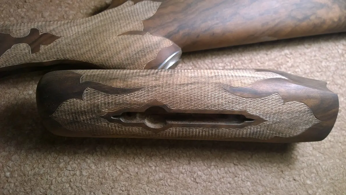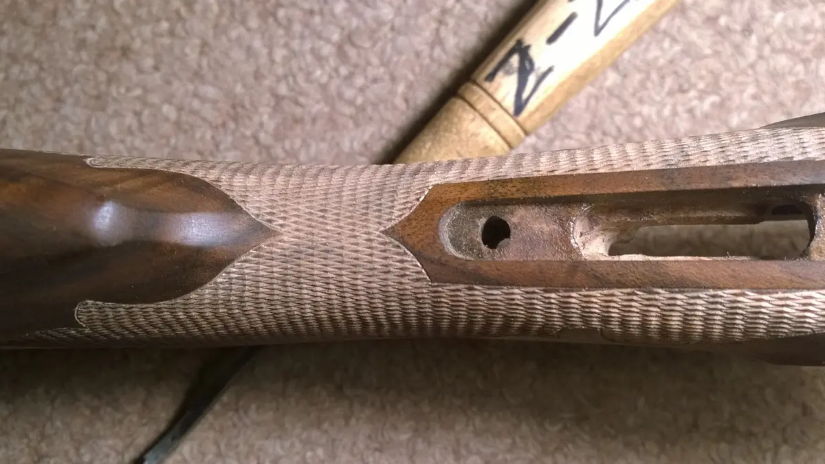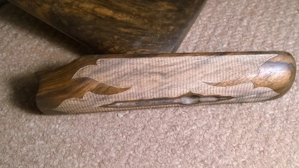 Knowing the gun would be viewed by the some of the world’s best gunmakers, Board chose to create a unique pattern. “When I received the stock set from Craig, I marveled at the crispness of his workmanship. The short length of the forend stumped me for a bit, as I’m used to having longer forends to checker. I remembered a Parker A-1 Special with a factory forend I restocked. I used this general concept as inspiration and modified it to fit the forend length.