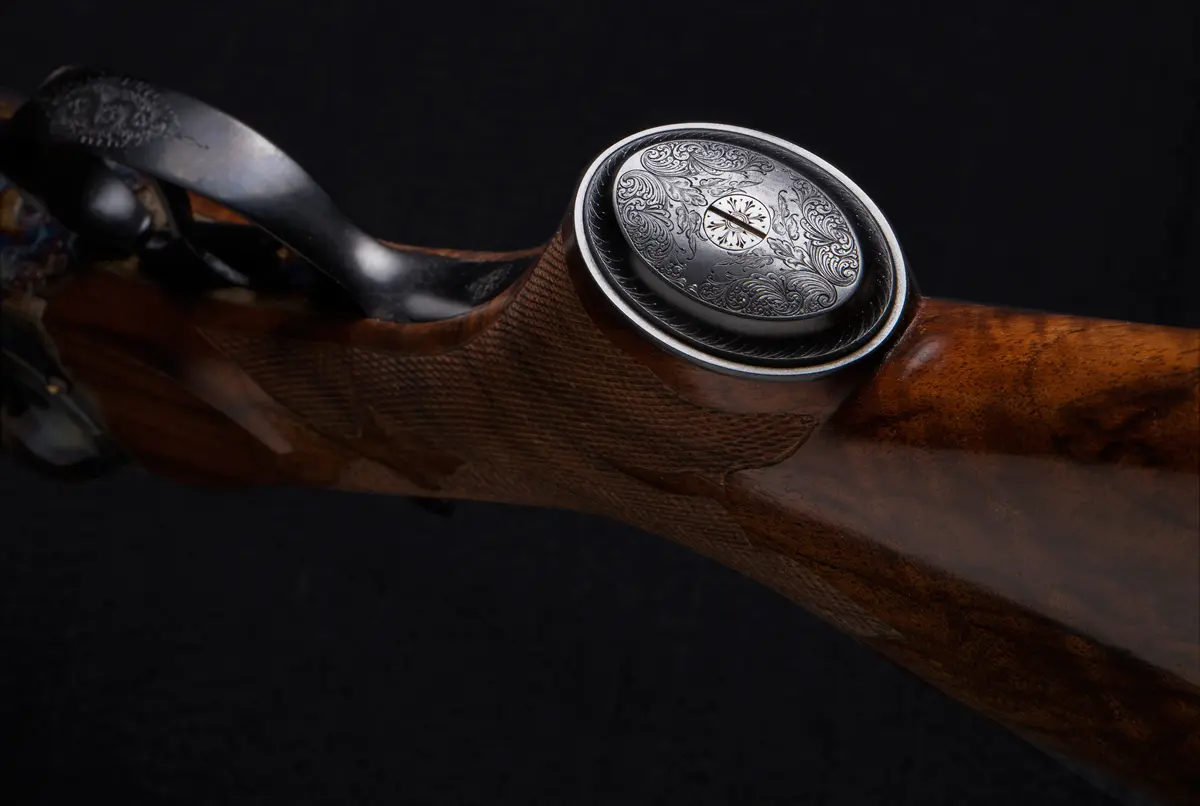 Engraver Jim Blair decided on tasteful scroll with enough coverage without being overly busy, and he executed it on the action sides, triggerplate, trigger guard, grip cap, fences and barrel-breech joints. “ACGG 2017” was placed prominently on the right barrel.