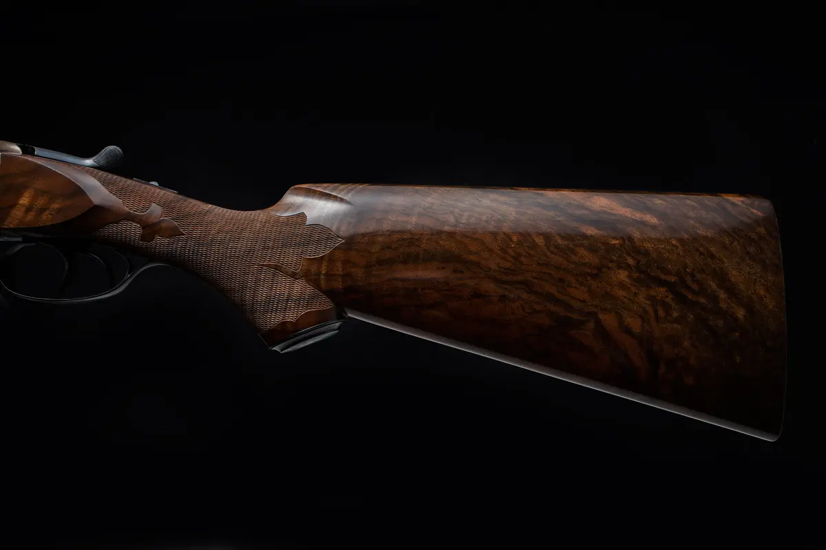The stick of Juglans regia was selected by Robert Watts of Watts Walnut. This project was conceived thinking of a live-bird/sporting-clays gun—a heavy field gun and perfect for the robust Teutonic donor platform. Thus, a Turkish walnut blank fit the bill well.