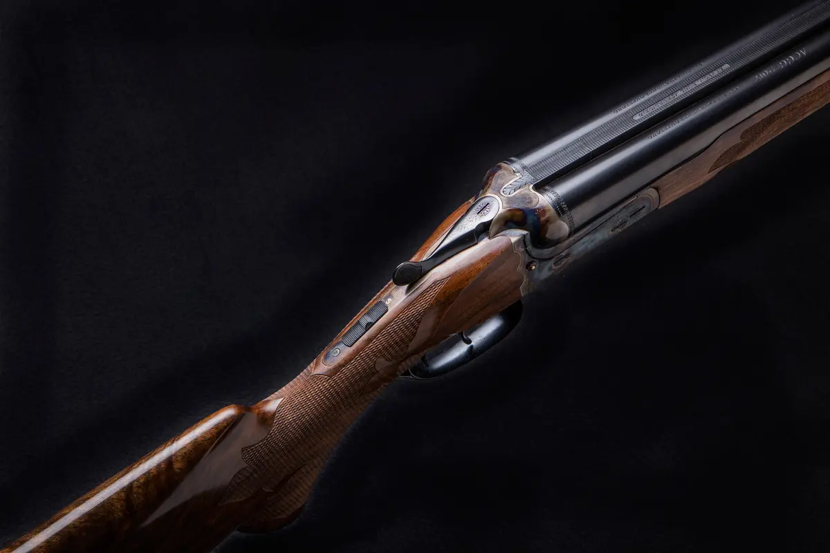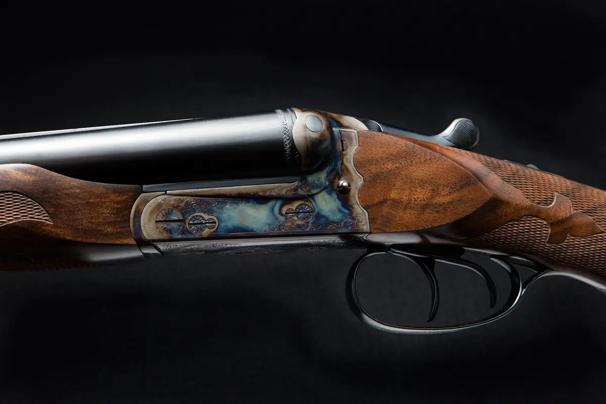 Doug Turnbull of Turnbull Restoration case-colored the action and forend iron. The rest of the metalwork was sent to Roger Ferrell for finishing, assembly and function testing. Roger blacked the barrels using traditional rust-bluing techniques, nitre blued the screws and assembled the components into the completed shotgun.