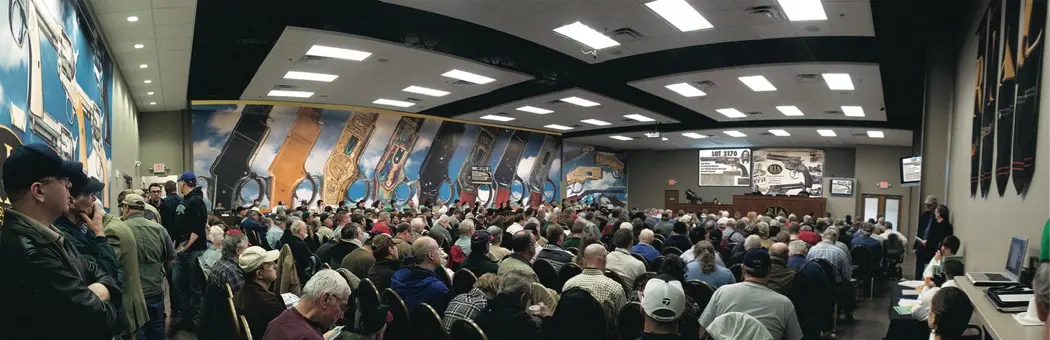 On opening morning, September 12 this past year, two dozen auction staff were lined up at the phones and computers, and a couple of hundred people sat expectantly in the sale room. Many of us were online, with phones, laptops or notebooks, and each of us had 6.6 pounds of Rock Island Auction Company catalogs in our laps. There were three of these glossy spiral-bound books, one for each day of the sale, with about 6,000 photos in all. They’re great reading, but if your mind wanders, you fall behind. How can they get top dollar at this speed?