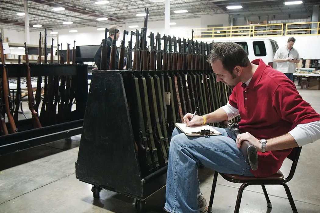 To a newbie, this sale had the feel of a once-in-a-decade event. Would it not take years to amass so many outstanding guns? In fact, just weeks. During a break, Judy Voss, Rock Island’s vice-president, marched me through the rest of the company’s sprawling 86,000-square-foot home (a former Coca-Cola distribution center in Rock Island, Illinois, about 170 miles west of Chicago), where long racks of guns were already being logged in, examined, written up and photographed for the next auction, in December. RIAC presently stages eight sales each year: three “premiere” events like this one, for upper-end guns; two so-called regional sales, of less-expensive guns; and three online-only auctions, featuring guns and gear that won’t bring in enough money to cover the cost of a live sale. According to Voss, in 2010, ’12 and ’13 the company set records with gross revenues of $32 million, $47 million and $48 million. With about 50 full-time and 40 part-time employees moving more than 20,000 guns each year, RIAC’s claim of being “The #1 Firearms Auction House in the World” is entirely believable.