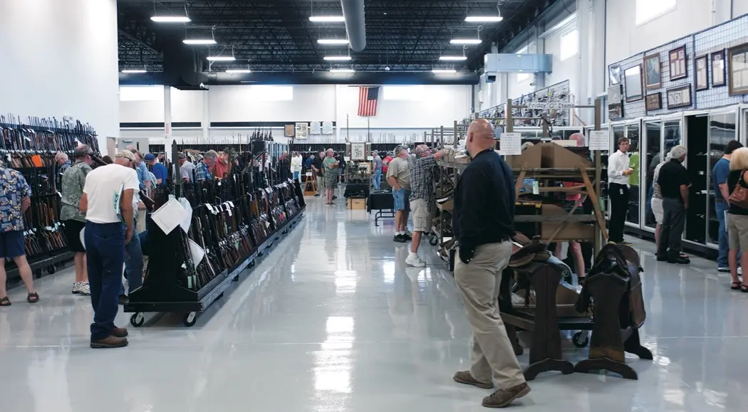The owner is a local man named Patrick Hogan, a dedicated serial entrepreneur. Hogan’s American Dream launched in the 1970s with one gas station that grew to a small chain of four. The service stations began to rent out videos, and then Hogan spun off that business into separate stores, which in turn expanded into photo processing, which led to a photography company . . . which enabled publishing a catalog for the first gun auction, in 1992, produced with a firearms enthusiast named Richard Ellis. Hogan soon bought out Ellis, and the first Rock Island gun auction took place a year later. Hogan wasn’t a “gun guy,” but—as with gas, diesel and road food, videos, family snapshots and local photography—he recognized a viable idea when it landed on his desk. Perhaps because he wasn’t distracted by the guns themselves, Hogan also saw that an auction is a numbers game. Let the clients get misty-eyed over craftsmanship, history and romance; he would figure out how to sell them more guns.