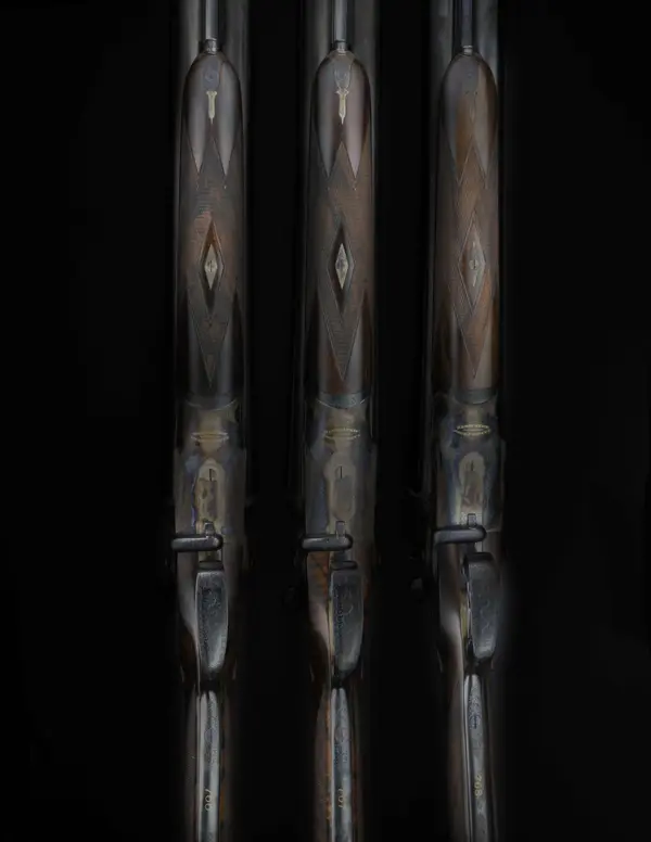 At the time, Henry Atkin made only “best”-grade guns, and these were actioned by none other than John Robertson, who in 1894 was still an outworker to the trade even though by then he was manager and half-owner of Boss & Co. True pairs of London-best hammerguns were never common; add sidelevers (and sideclips), and the number shrinks considerably further. Now consider that these are also ejector guns and that there were three of them, not two; that they now have survived for 123 years, and they’ve been reunited, and they’ve been properly brought back to life . . . . Likely they are unique today, and possibly they were back in 1894 too.