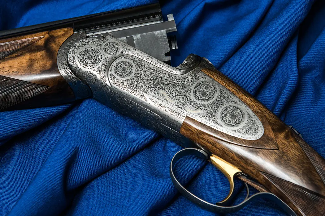 Today Beesley is back in business, not with the side-by-side built by Purdey or even the Shotover but with two new over/unders called the Fenice and the Eleganza. The Fenice has a triggerplate action and is available in 12, 16, 20 and 28 gauge with coil springs and a choice of a round or square body. It features classical floral scroll by Beesley’s in-house engraver, “Perlotti.” A range of Fenice guns are available in Beesley’s Kings Road, London, store for £32,000 a pair, or about $40,000 (including 20% VAT). The Eleganza is a made-to-order triggerplate gun available in the same gauges and with coil or V springs and a round or square body. It features all of the variants suggested by the term bespoke, including custom engraving. A pair costs £82,000, or about $103,000.