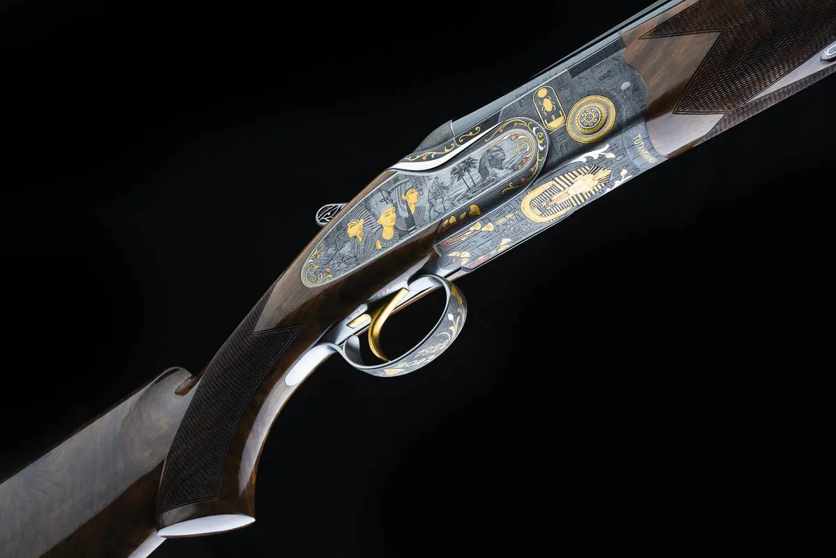 In search of inspiration for the work, Master Engraver Luca Casari journeyed to Egypt’s Valley of the Kings. Spending several days at the world-famous archaeological site in Luxor resulted in a singular gun exhibiting more than 1,000 hours of bulino-style hand engraving. Casari’s work features gold, green gold, silver and copper hand inlays on an SL3 EELL 12-gauge with 30-inch barrels and an Exhibition Grade 5 European-walnut stock in a field configuration.