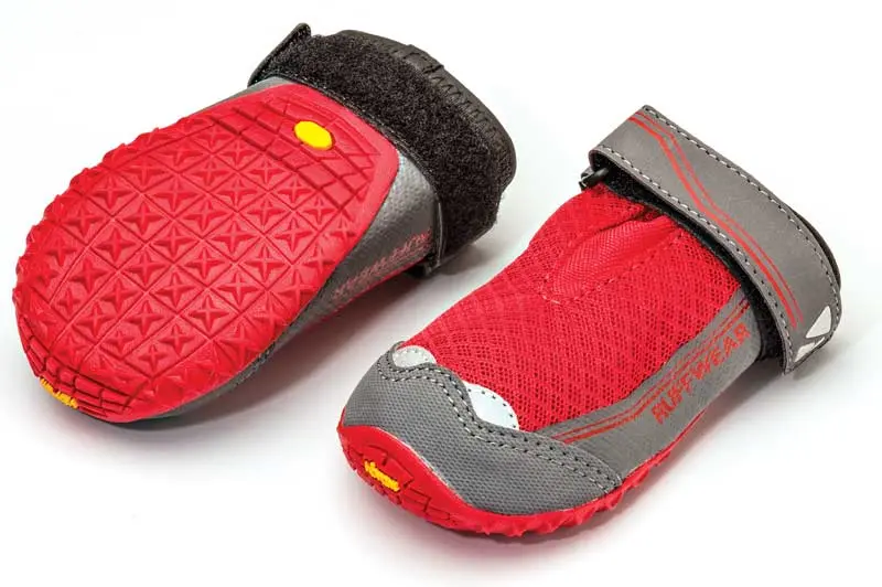 Grip Trex boots have Vibram soles and were the easiest boots to put on of the test group. A single Velcro strap holds the boots on and in our testing did a good job of sticking to the dog’s feet. If I were using the boots in tall grass or on a big-running dog, I might want to put a couple of wraps of tape on for added security. The boot soles are robust and did a great job protecting against stickers and ground hazards. The boot tops are a breathable mesh that does not do as well against thorns, so these boots would not be my first choice in the thorny Southwest.