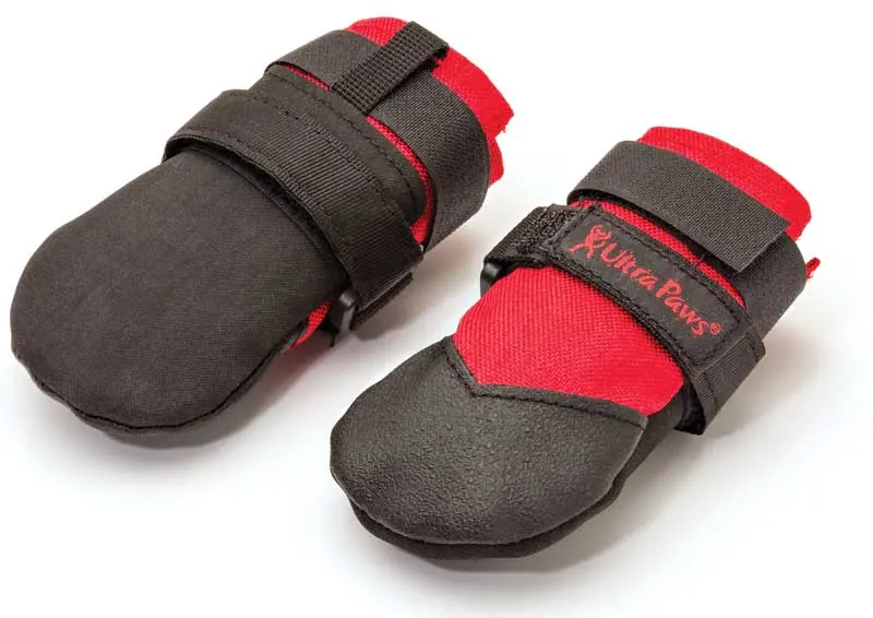 The Ultra Paws Rugged Dog Boots were the lightest of all the boots, and we really liked the fastening system, which includes foam blocks inside the boots beneath two Velcro straps. The foam helps the boots stick to the dog’s feet, and the straps keep them latched on reliably. An athletic dog might benefit from a wrap or two of duct tape to prevent boot loss. The soles and tops of the boots are thermoplastic over nylon and not up to hard use against basalt and thorns. That said, for close-working dogs, for protecting an injured foot or for light-duty use, these are very user friendly and stay on really well.
