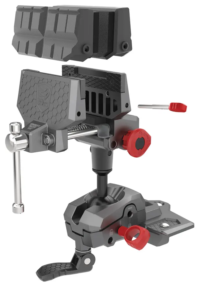 When you return from the range and need to clean your gun or do some maintenance or repairs, a great tool to have on the bench is the Real Avid Master Gun Vise. Made specifically for working on guns, the vise features reversible stainless-steel jaw plates, reversible Gun-Fit sleeves (one side grooved, semi-rigid nylon, the other padded for a compression fit and to protect wood stocks), a leveling knob with six degrees of micro adjustment, an articulating ball-and-socket joint with locking lever (for repositioning a gun without having to remove it from the vise) and a quick-adjust crank. A Torq-Lok pin locks the ball-and-socket joint for applying heavy force.
