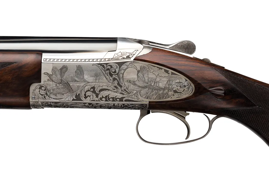 The signed engraving is 100-percent coverage of the receiver, sideplates, trigger guard and forend iron. Careful examination with a jeweler’s loupe showed that the engraving was done first by laser, and then hand chased for an upscale look and texture. Our B sample had gamebird scenes on the sides and bottom surrounded by floral scroll. It certainly was nicely done.