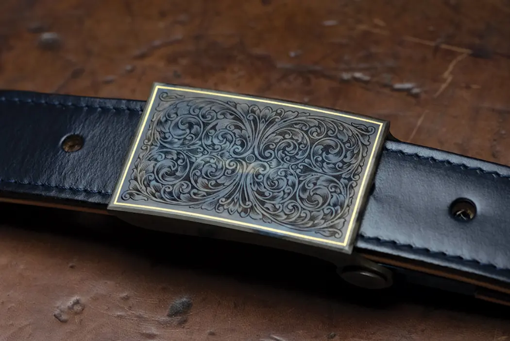 The talented gun-engraving family of Dave, Brad and Wesley Tallett have buckled into the idea of making belts of hide with ferrous fasteners. For those unfamiliar with British gun engraving, Brad and Wes are sons of Dave. Wes trained with Holland & Holland, while Dave and Brad have engraved extensively for James Purdey & Sons. According to Brad: “A couple of years back my father had decided to retire from full-time gun engraving and as a sort of hobby project started making belt buckles using and inspired by gunmaking techniques, finishes and, of course, engraving. He designed, manually machined, filed, polished, engraved and finished a belt buckle inspired by the fine-quality guns he had worked with.”