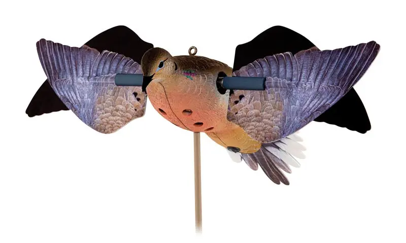 Dove hunters who prefer close-in shooting will be drawn to the new Avian-X PowerFlight Dove decoy. The life-size motion decoy features an ultra-realistic paint scheme, true-to-life posture and wings tuned to spin naturally in winds up to 30 mph. The patent-pending wings spin 360° with contrasting colors that attract doves from long distances. The PowerFlight Dove has a water-resistant housing and operates on AA batteries (not included), with a battery life up to 16 hours. It comes with a mounting stake with an arm extension (providing two mounting options) and a protective carrying bag. Price: $60.