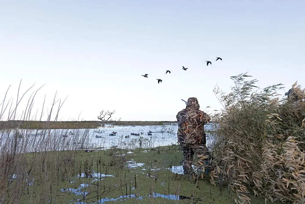 During my trip to Malalcue, we hunted a harvested cornfield about 45 minutes from the lodge. At the edge of the field was a row of trees where decoys were set up in front of a blind made of cut brush. When we arrived, the decoys were already in place, and there were two stools in the blind along with a case of shells. The decoys had been set on the ground as well as on metal rods and cornstalks. As the morning progressed, we added dead birds to the spread.