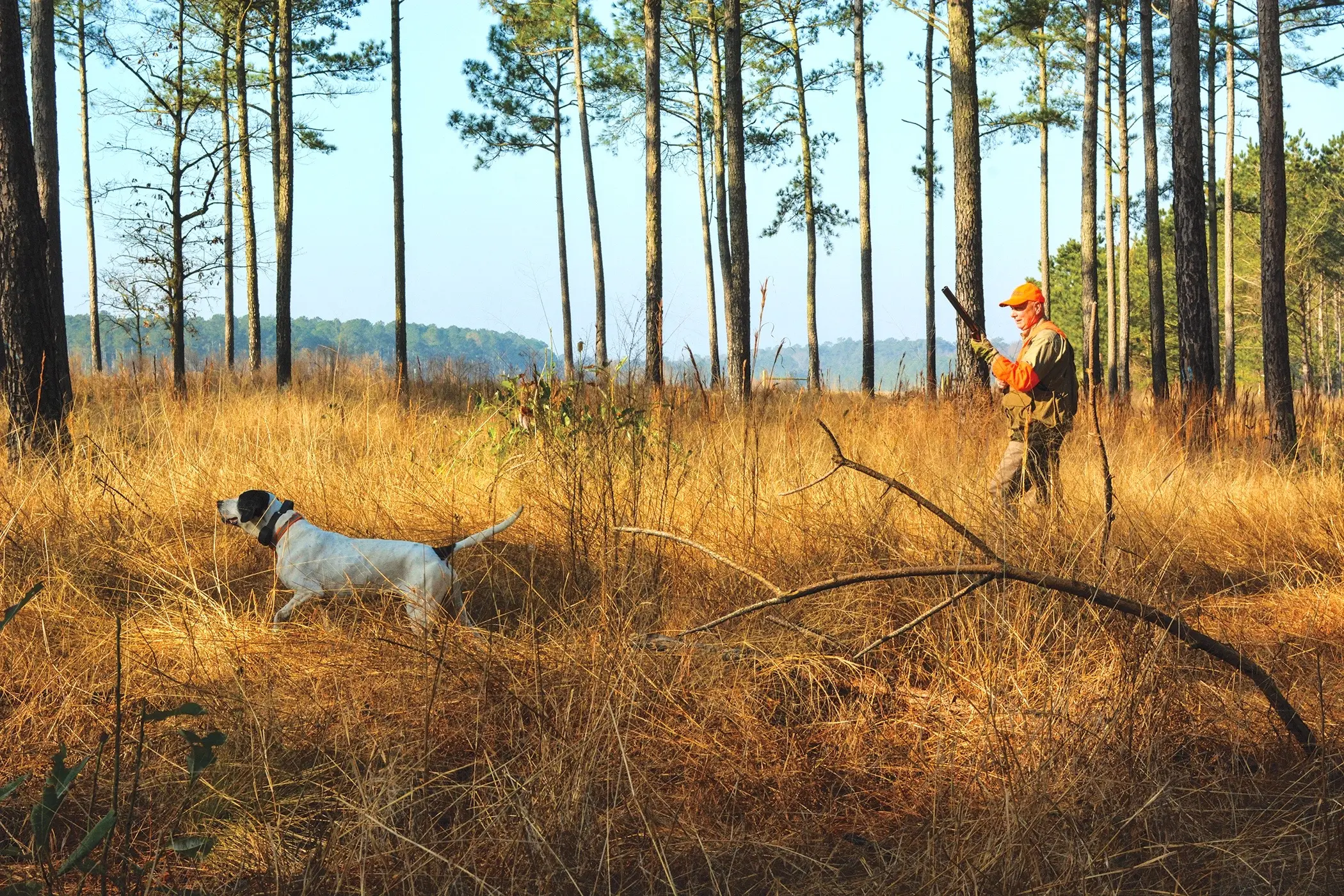 They would have recognized the landscape reemerging at George Hi—and the feeling I’m getting as we move deeper into a tract of timber, trunks blackened with a recent controlled burn and underlain with newly restored grasses. My breath drifts from left to right, signaling a crossing wind, and George Hi guide Bryan Hargrove lets Jake range a bit farther, giving him room to loop and swing and work the wind without being underfoot.