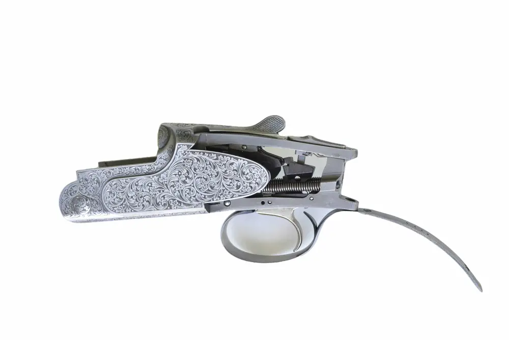 And then there is the outside of the receiver. If you like fancy, here it is. Every bit of metal on the gun that isn’t part of the barrels is covered with laser engraving. The false sideplates just make the canvas larger. The engraving is in an acanthus-leaf floral pattern executed by the major engraving house of Bottega Incisioni di Cesare Giovanelli. The lasering has decent depth, and the new machinery was able to laser around some curves, so it probably was a five-axis machine. Not only are the receiver’s top, bottom and sideplates engraved, but so are the forend iron, opening lever, top tang, extended trigger tang and grip cap. In all the engraving doesn’t appear to have the three-dimensional depth that the Incisione Ri.Pa. laser engraving on the 2012 side-by-side had, but it is very nice. In keeping with Kelly’s love of quail hunting, there is the engraved figure of a quail in flight on the bottom of the receiver.