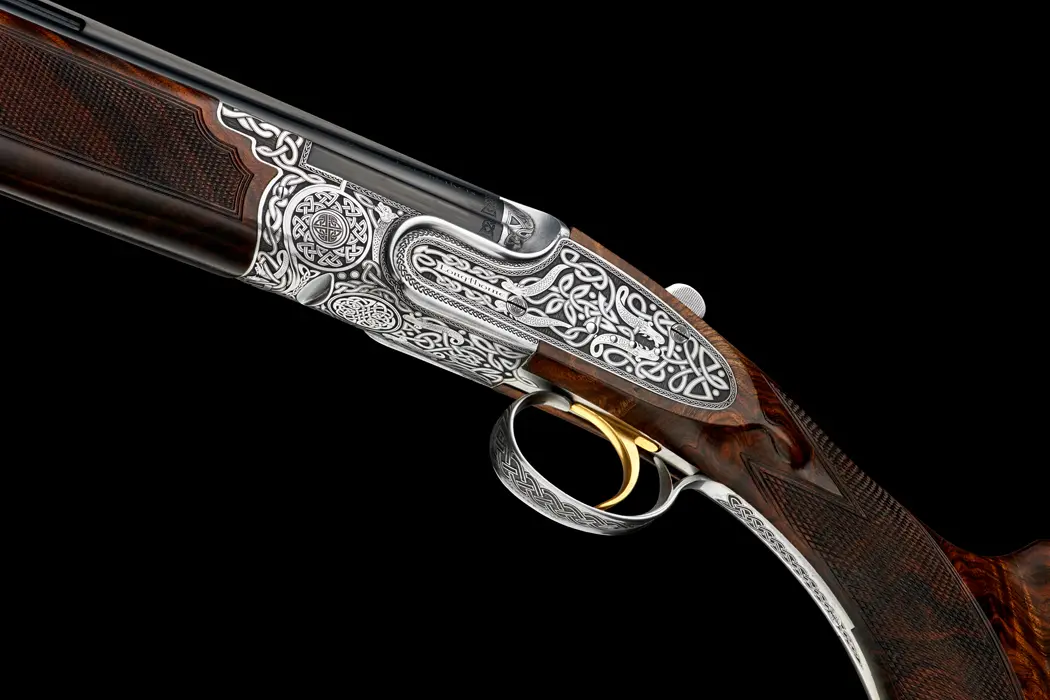 “It gave us great pleasure to hand over our very first 28-bore to a very happy client,” said Marketing Director Elaine Stewart. “This first was a Celtic design, with 30-inch barrels and three-quarters, three-quarters fixed chokes and weighed just six pounds. This gauge has been a long time coming. New models always take time to perfect, but we are proud of the end result. Another landmark in the history of Longthorne.” She continued: “The Celtic is our own in-house design, and we can put either a rose, dragon, thistle or shamrock on the toplever, depending on where the customer has ties.”