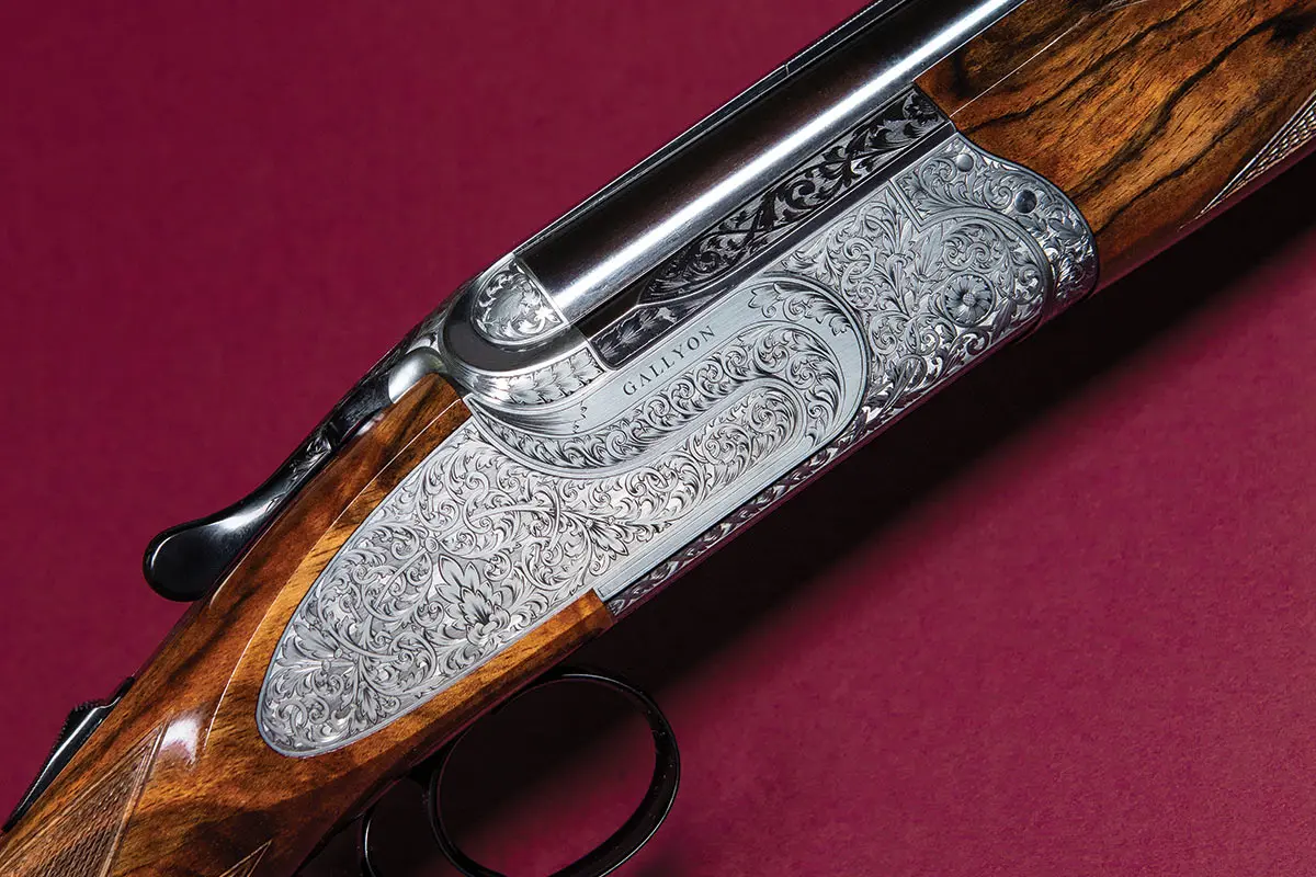 With more game shooters choosing over/unders over side-by-sides, Gallyon’s two new O/Us perfectly reflect demand. The Holkham has a triggerplate action and sideplates richly engraved with Gallyon’s house style of scrolling vines. The Cambridge has a scalloped-back action clearly intended to emphasize the simple elegance of its lines.