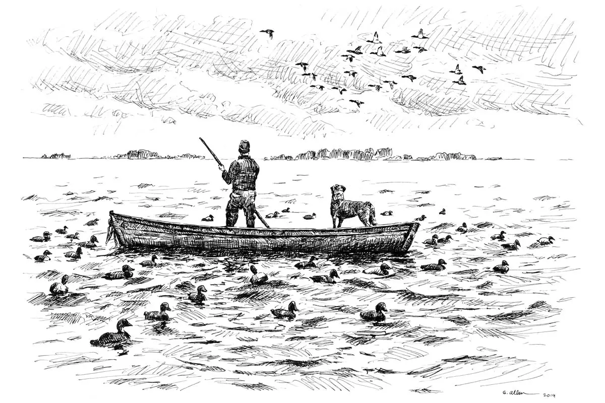 On the best of all days the wind will come hard, ushering in migrant skeins of ducks and geese. On big water like Saginaw Bay the ducks gather in enormous rafts and come and go when they please. What seems chaotic is prescribed order beginning with teal in September and closing with goldeneyes by the new year. That said, my favorite month to hunt waterfowl is November. The days are cold, meaning another layer of clothing, but not so cold that one must break ice to reach the blind. Local mallards and other dabblers are gone, having been replaced by migrant swarms of diving ducks and geese reared somewhere else.