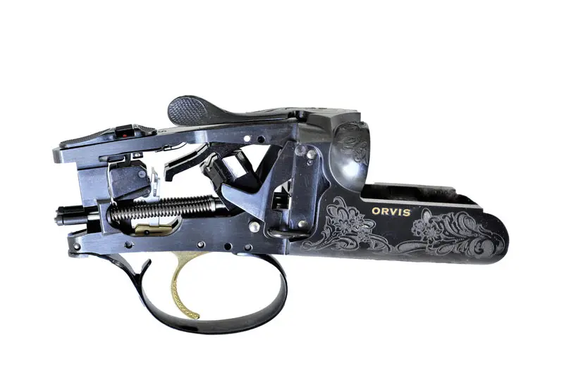 The exterior of the receiver is dark blued like the rest of the gun. It is nicely laser engraved in an ornamental floral pattern but, being almost black on black, you have to get close to appreciate it. On each side in small gold letters is “ORVIS,” while on the bottom of the short trigger guard is Fabarm’s symbol of a small gold lion.