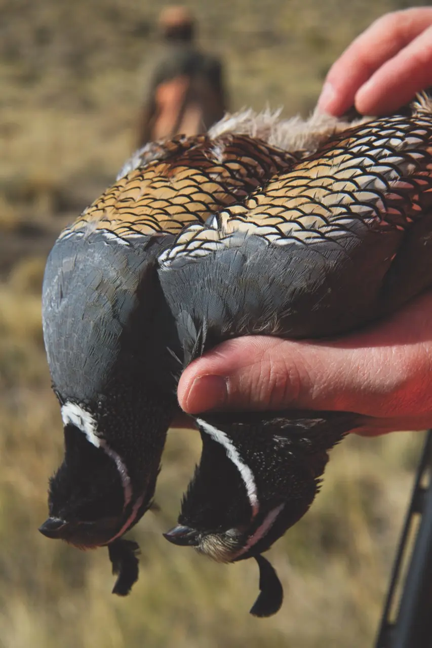 John, displaying the reflexes of a lifelong quail hunter, dropped a double, and Wanna delivered them to hand. Both were beautiful cockbirds, replete with the black topknots and throat patches, gray breasts, and chestnut-colored bellies with dark scaling that characterize California, or valley, quail.