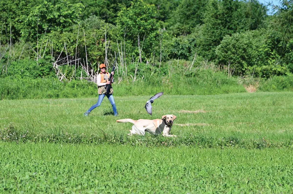 With a pigeon tucked away in the grass, it’s just a matter of guiding the dog left or right as you walk in a zig-zag pattern. I’ll use different language than I use during waterfowl training. I might say, “Hunt ’em up!” or “Find the bird!” as we head into the field, but I keep talking to a minimum. As you work toward the planted bird, make sure your dog ends up downwind of the pigeon. Your dog might catch the bird or it might flush the pigeon, giving you a chance to shoot it. Repeat in all sorts of different cover whenever you have the opportunity, and work on control before and after the flush so you’ll be ready when the season rolls around.