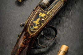 Purdey’s latest reveal is housed in a brass-mounted oak-and-leather case lined in Woodward scarlet goatskin (rather than Purdey burgundy) with Woodward-name accessories in form-fitted cutouts in the French manner. A leather-bound limited-edition history of James Woodward & Sons written and signed by Purdey’s Gunroom manager, Dr. Nicholas Harlow, completes the package. With its seductive mix of nostalgia and rarity, this Purdey-Woodward functional commemorative is armed with attributes likely to seduce seasoned collectors and those new to the field of firearms.