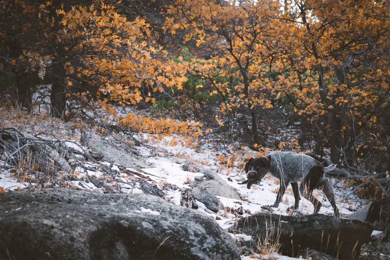 The Sierras are home to not only North America’s largest quail but also the tallest peak in the Lower 48: Mount Whitney, which stands 14,505 feet. I’ve been to Whitney’s summit, and you can relax knowing that this is not where you need to go to find these birds. Chasing mountain quail in California’s Sierra Nevadas involves navigating thick manzanita bushes, climbing huge granite boulders and struggling up steep and sandy hills. The seasons open early and, as a result, temperatures can be incredibly hot, sometimes reaching triple digits. One benefit of hunting the early season is the birds’ dependence on water, which makes narrowing down places to search a lot easier. If you’re in mountain quail habitat, starting your search around perennial water is a smart bet, both for locating birds and so you don’t have to carry as much water for the dogs. The terrain here also can be rocky, and often you’ll find yourself navigating between rock formations. The granite rocks are sharp and, while your boots may grip them beautifully, they can tear up a dog’s paws quickly—especially with dogs not accustomed to the sharp rocks we face out West.
