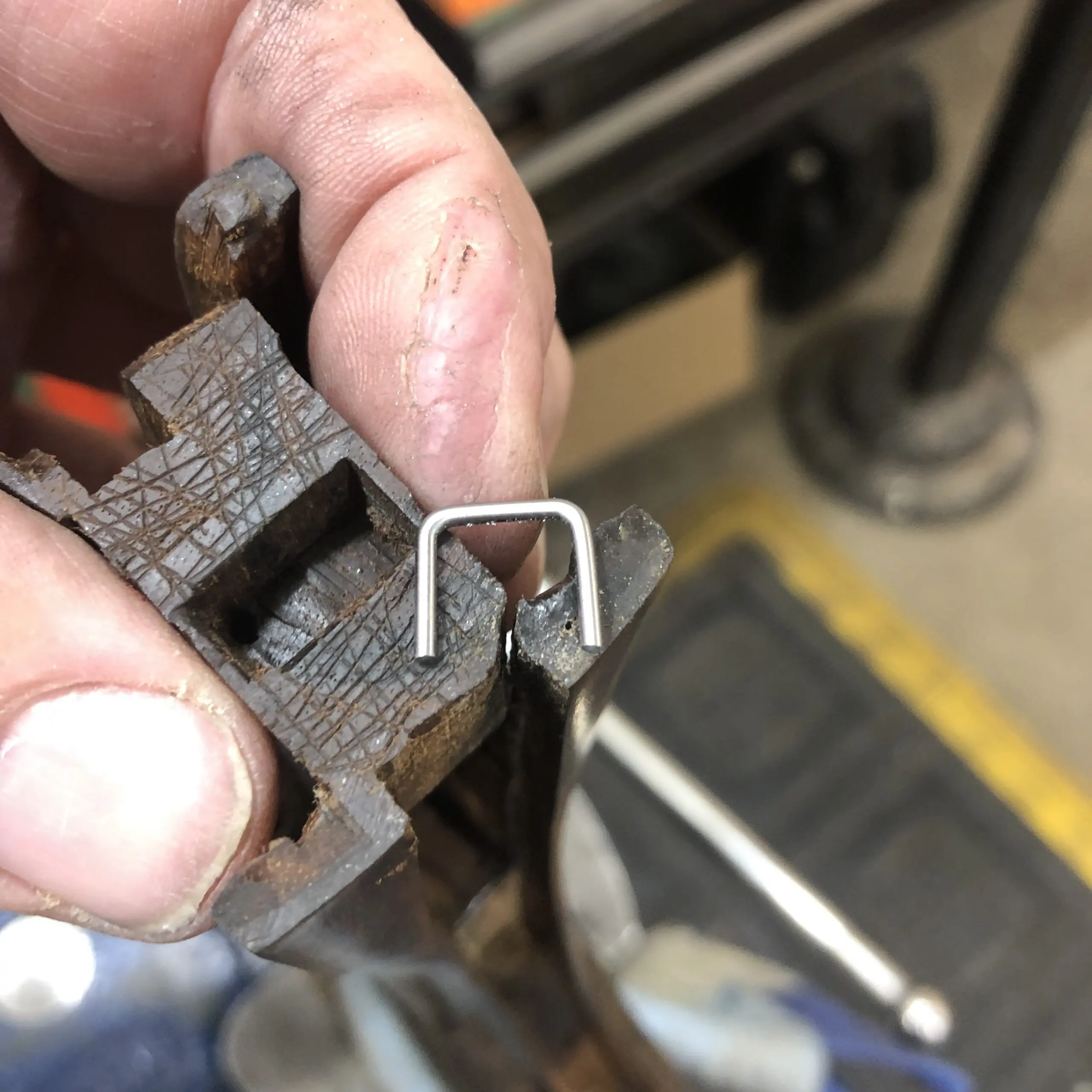 First I precisely drill the holes for the legs of the staple, taking great care to not over-drill the hole and cause further damage. Then a very narrow chisel is used to cut a track between the two holes, so the top of the staple will sit flush with the recoil surface. The staple is made from high-tensile-strength spring steel that is very strong in relation to its diameter. Using several sets of parallel-jaw plyers, I form the staple to exactly the right shape and dimensions. The staple is then glued in place using a very strong yet flexible epoxy. I then apply a very thin layer of epoxy that has fine fiberglass flock mixed in to the recoil surface. This thin layer of fiberglass-reinforced epoxy adds great strength and rigidity to the recoil surface and helps to evenly distribute the force of the recoil. Once completed, this repair is completely invisible when the gun is fully assembled.