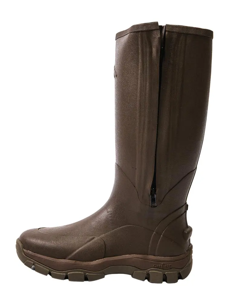 As it did with its oft-praised waders, Chêne Gear, the Memphis-based producer of quality waterfowling gear, got its Zippered Knee High Boot right. The boot features supple, natural rubber over a neoprene liner, providing warmth and a soft and comfortable interior. It slips on comfortably—making the full-length zipper (with waterproof gusset) often unnecessary but handy when tucking in pants—and there is a heel kick for easy removal. The boot also comes with an extra 7mm insole to customize fit. The tread seemed the least aggressive of the boots tested, with a stylistic use of the company name’s circumflex accent as the pattern. Colors: Olive, Brown (shown), Mossy Oak Bottomland, Mossy Oak Original Treestand. Sizes: Whole 6 through 14. Height: 16¾”. Weight: 5 pounds 12½ ounces per pair. Price: $240. Chêne Gear, chenegear.com.