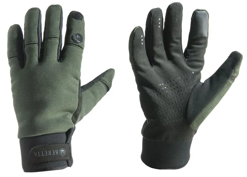For hunting in wet and windy conditions in moderate temperatures, Beretta’s WaterShield Gloves provide protection and a secure grip. The gloves are made of breathable Polartec Windpro material and have a water-resistant membrane. Fingertip inserts allow for using touchscreen devices, and index-finger tabs can be secured open with hook-and-loop fasteners. The gloves have elastic neoprene cuffs and anti-slip inserts on the palms that aid in gripping.