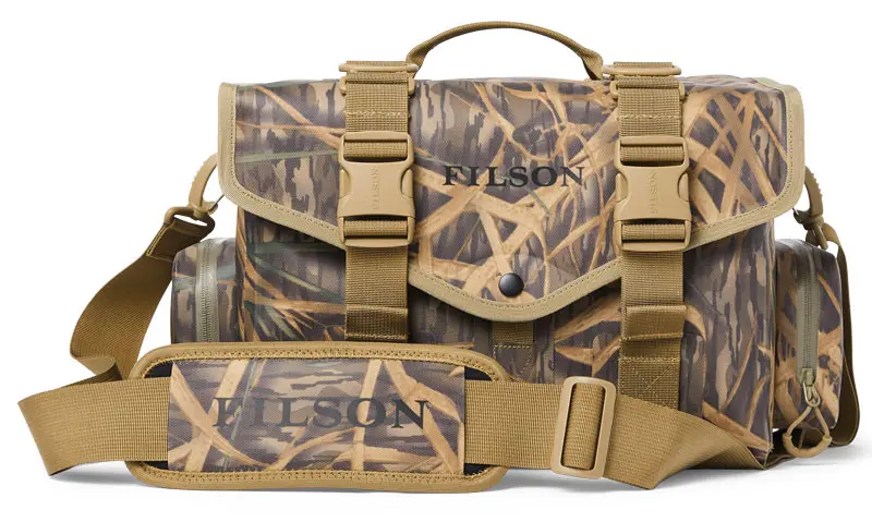 For keeping gear dry, organized and protected, Filson’s Camo Sportsman Dry Bag is a watefowler’s best friend. The bag is made of 900D nylon with a TPU (thermoplastic polyurethane) coating. Seams are radio-frequency welded. The top opening has a heavy-duty TIZIP waterproof zipper and buckle-secure over-flaps. There also is a top flap that secures with buckles and a snap. Inside there is a padded, removable insert with adjustable dividers as well as a zippered mesh pocket. Other features include zippered end pockets, a clear pocket beneath the top flap, a detachable padded shoulder strap, D-rings for gear attachment, and a top carrying handle.