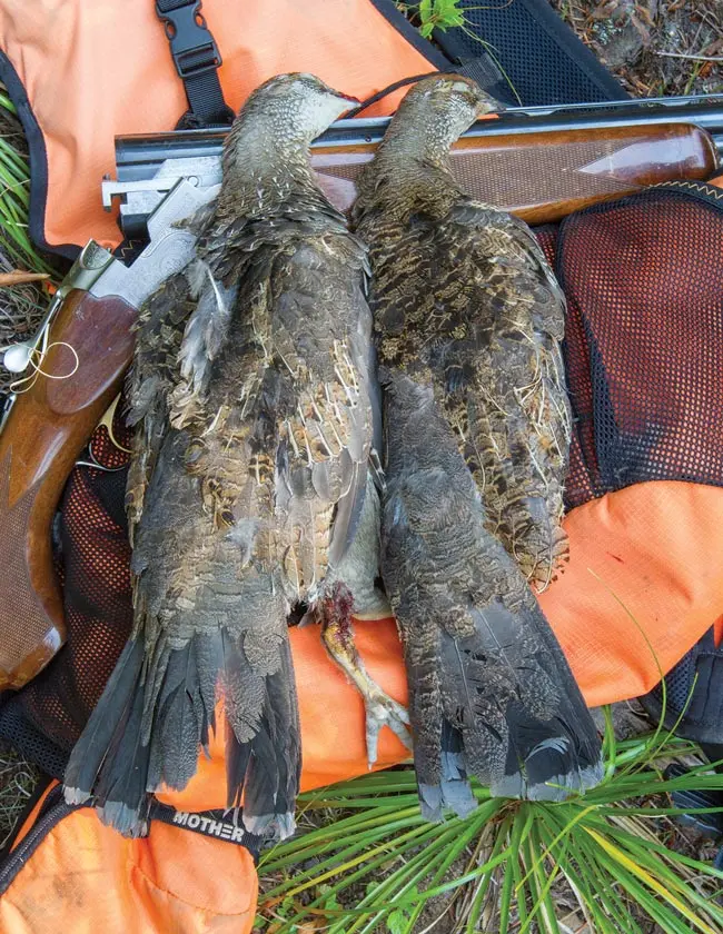 During these rejuvenating grouse seasons, I explored new coverts, wearing out boot leather and trusting what I’d learned about these birds many years prior: Sooty grouse live in mature coniferous forests, but they like openings in the form of natural glades, hanging valleys, aging clearcut edges, timberline meadows and sunlit tentacles of old forest fires that reach into stands of Douglas fir, true fir and hemlock. The birds like steep slopes, but hens with broods often forage on lesser inclines, even level expanses if they have sufficient escape cover. Multiyear males often occupy old-growth forests on steep, deeply shaded north slopes, especially those with swales and open ridgetops. Sooty grouse thrive on berries and are especially fond of blue huckleberries, which are prolific in the high Cascades. Those berries lend the birds’ medium-dark meat a delicate flavor with a touch of sweetness and not a hint of gaminess. As their diets shift away from berries in October and early November, that faint sweet flavor dissipates; but they remain exceptionally fine fare through autumn.
