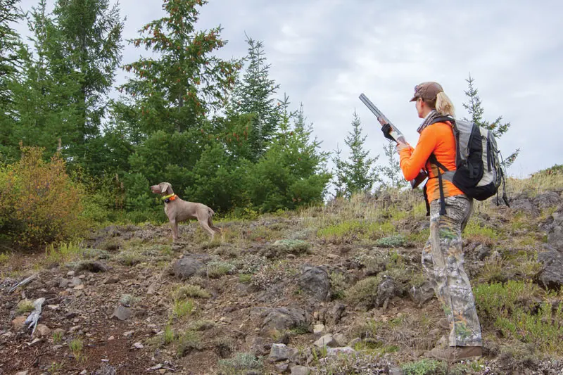 On the last day a steely fog clung stubbornly to the highlands as we hiked up a trail that hadn’t seen a boot print since August. Halfway up a precipitous butte, the switch-backing path emerged from the leaden gloom into clear blue skies. Deep-green firs accented acres of orange-painted huckleberry shrubs, and high up on the ridgeline spritely fresh snow gleamed in the morning sun. Java tested the air, nose held high, and then turned and coursed downslope. Her tail told the story—hyper-speed windshield-wiper mode meant she had scented grouse. She wedged her way through a sweep of willows, and then disappeared behind a grove of firs. Her beeping locator collar switched to the steady point-mode cadence.