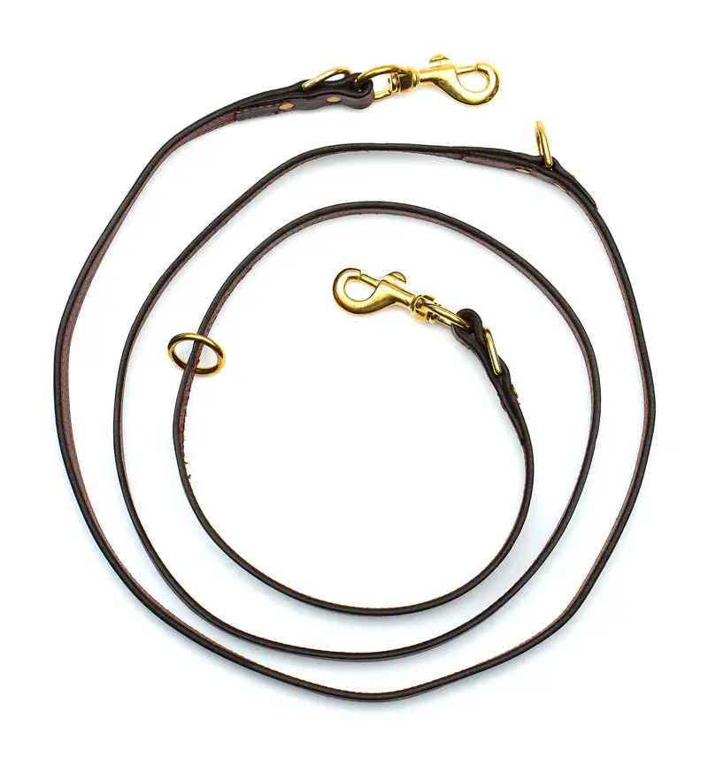 “Jaeger” means “hunter” in German, and Mendota’s Leather Jaeger Lead offers the ultimate in versatility for the hunter or dog trainer. This flat leather lead has a swivel brass snap at each end, three D-rings and a floating O-ring, making it a do-all, versatile lead for dogs of any size. It can be used as a slip lead or in conjunction with a flat or choke collar for a variety of obedience work. By manipulating the various snaps and rings, it can be used as a 6' or 4' obedience lead; as an over-the-shoulder, hands-free lead; as a temporary tie-out for hooking a dog to a post or tree; or to walk two dogs at once. Fully extended, it is long enough to let a dog range out a bit, say, for tracking. The lead can be carried in a hunting vest or clipped and looped around the shoulder. Because the Jaeger Lead is made of leather, it will absorb water and will need to be treated to prevent it from drying out. Length: 8'. Width: ¾". Color: Chestnut. Price: $55.