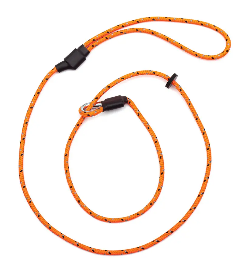 The Sporting Saint Field Trial Pro Lead is made in the UK and marketed in the US by English cocker breeder Ryglen Gundogs, indicating the size of dog it’s intended for—although it can be used with more-compliant larger dogs. The braided nylon slip lead is lightweight but strong and very flexible. A stainless “thimble” allows the rope to glide through smoothly, and a rubber stop prevents the lead from loosening and slipping off the dog’s head. A loop at the tail end serves as a handle. With its small diameter (¼"), the lead allows for quick, precise corrections. It is ideal for close-in obedience work, such as teaching a dog to heel or sit, but it is too short to let a dog range out. The lead can double as a walking leash, and the small, compact size makes it easy to coil and carry in a pocket. Length: 4'. Color: Orange. Price: $25.
