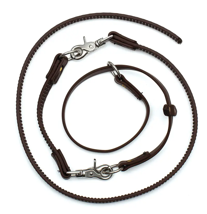 The Wildrose Combination Training Lead is a British-style slip lead with three pieces: a lead, a “steady tab” and a slip collar with keeper. Developed by Wildrose Kennels owner and Labrador trainer Mike Stewart, the lead is made of a strong, rubberized material that is waterproof and easily cleaned. The three-piece design allows you to remove the lead portion (36") and leave the short steady tab (11") as a reminder to the dog to remain obedient and as a grip that won’t interfere with the dog running or swimming. Because the sections are connected with heavy swivel latches, there is a lot of metal banging around—which could be intimidating for young or small dogs. The lead also lacks a handle, or tail hold, so it is not an ideal walking leash. It is available with grip dots (shown) or without. Length: 6'. Width: ¾". Collar lengths: 22" or 26". Colors: Brown (shown), black, light brown and orange.