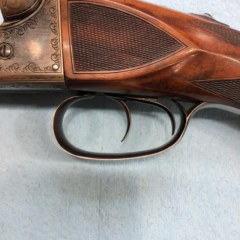 In a perfect world, a double trigger’s form and function integrate as follows: By virtue of limited space internally, double triggers must be nested, with trigger blades situated more or less in line but the front trigger oriented on the shooter’s side of the rear trigger (i.e., the front trigger on the right for a right-handed shooter). The front trigger is crafted in an arc that positions the bottom, or point, of the trigger blade no more than 1⁄16" from the inside of the trigger guard. The blade is graceful in both arc and contour (cross-section) and canted, or turned, in the direction of the trigger hand (i.e., clockwise for a right-handed shooter). The arc should be of a radius to accommodate the “standard-size” trigger finger, and the trigger should be positioned far enough forward to create space between the front of the trigger guard and the front trigger for comfortable acquisition while leaving sufficient space between the front trigger and the rear trigger for same. Full depression of the rear trigger should place it close to but not touching the rear, inside portion of the trigger guard, which should be shaped to follow the arc of the rear trigger blade. The rear trigger should be canted somewhat similarly to the front trigger. In effect, triggers should move precisely, and travel should neither create contact with the trigger guard nor leave space for a finger to get caught up and cut. Oh, and it all should look graceful—trim and sleek and well-finished.