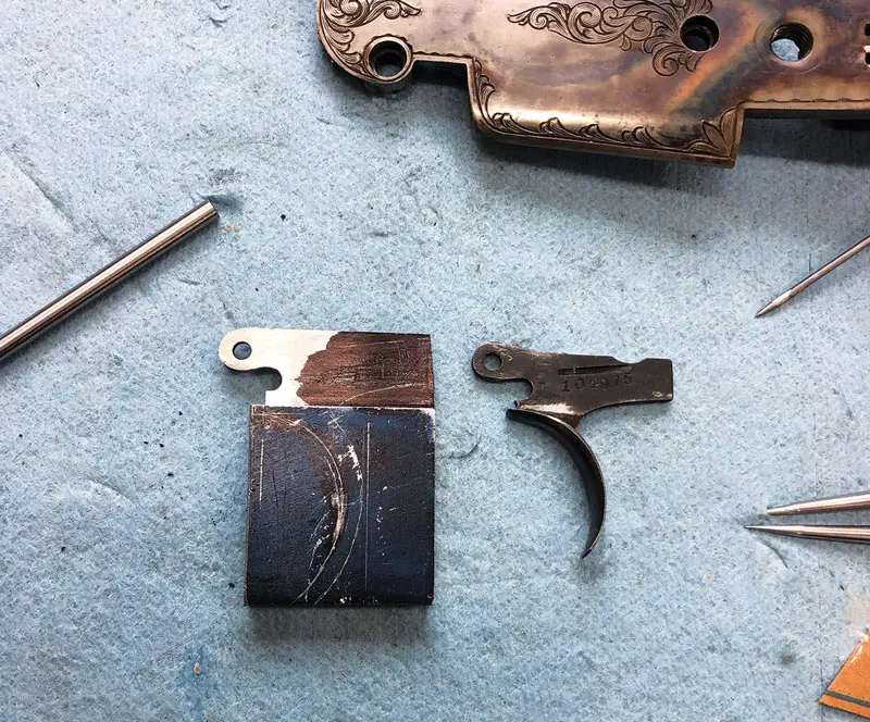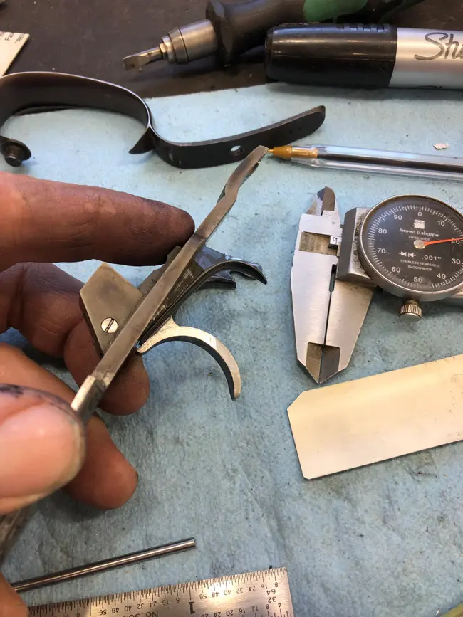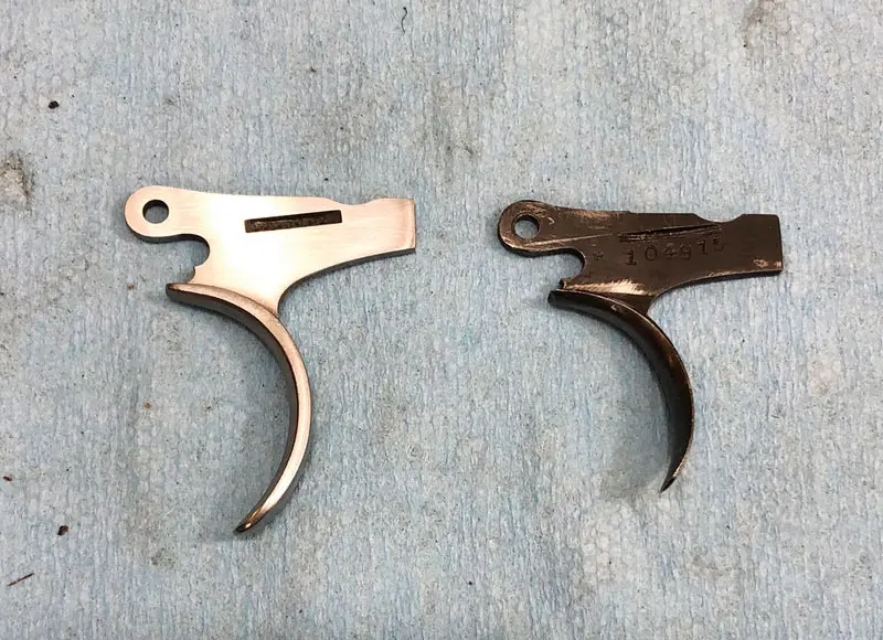 Upon investigation, it became clear that the trigger had been bent or broken at some point, shortened, tidied up quickly and put back into use. The necessary fix would be to replace the front trigger in its entirety, a procedure that is oddly common in the workload of better gunsmiths. A deeper look into the initial problem and the ensuing fix provides an opportunity for a better understanding of trigger construction, proportioning and shaping. There is far more to the humble trigger than meets the untrained eye.