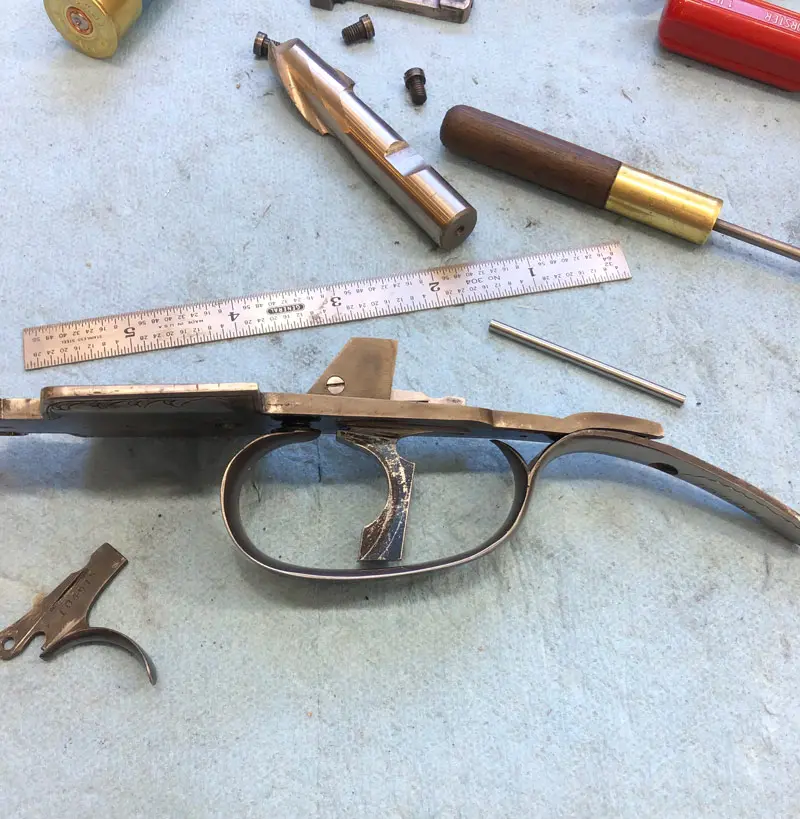 Case in point: a nice old Parker that recently arrived in the shop of DC Whitman Custom Gunsmithing with a long-neglected trigger issue. The gun was of relatively high grade, with the original wood in good shape and engraving that was well executed. The owner, who recently had acquired the gun, was complaining of a problem with the trigger: namely that upon firing the front trigger, his trigger finger was getting cut somehow or the trigger finger of his glove was getting torn. The gun was, for this reason, effectively unshootable.